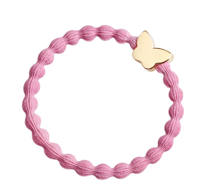 Gouden vlinderbedel op een bubbelrekker.